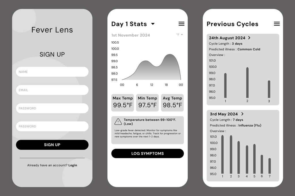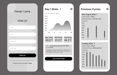 Based on user research, I identified key areas for improvement in the app’s design. To make symptom logging less repetitive, I gamified the process with interactive toggles for quick responses, sliders to rate severity, and a progress bar to encourage completion. To help users track their health, I created a feature that visualizes temperature trends over time, allowing them to easily see fluctuations and patterns in their data. Predictive insights are provided after collecting 3-7 days of data, helping users understand potential illness trends. For medication management, I designed a simple, timeline-based tracker with color-coded doses and reminder notifications to ensure users stay on schedule.